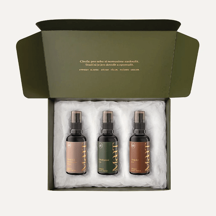 Domov má mnoho podôb. Tri vône bytových parfémov v tomto balíčku dovoľujú obdarovanému meniť atmosféru domova podľa nálady, pocitu alebo potreby – bez ohľadu na ročné obdobie. Každý z nich je vytvorený odbornou aromaterapeutkou z čistých, vysoko kvalitných éterických olejov, bez syntetických vôní a ďalších zbytočných prímesí. Vďaka tomu nielen krásne prevonia priestor, ale aj aktívne čistia vzduch, harmonizujú myseľ a pozitívne ovplyvňujú náladu.