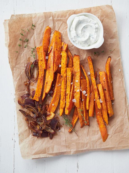 Bulku rozrežte, namažte sojanézou, pridajte zeleninu, cícerový burger, priklopte a podávajte s batátovými hranolkami.