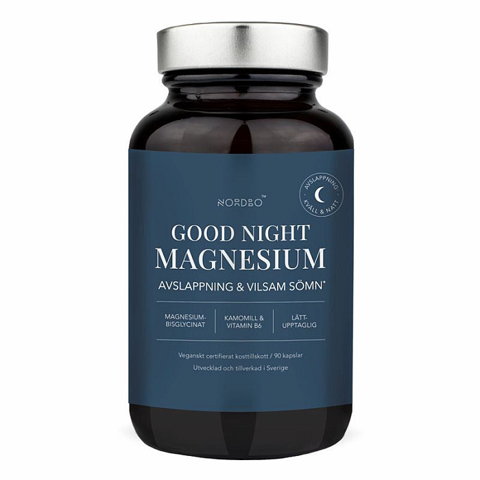 MAGNESIUM GOOD NIGHT Výživový doplnok s obsahom horčíka. - PODPORA KVALITY SPÁNKU - Bisglycinát horečnatý - Extrakt z kvetu harmančeka - Vitamín B6 - Certifikát I'm Vegan organizácie Djurens Rätt (Animal Rights) - Produkt neobsahuje živočíšne zložky, spojivá a nežiaduce balastné zložky - NORDBO = kvalita Good Night je účinný prírodný doplnok na podporu pri nespavosti. Obsahuje organickú formu horčíka - bisglycinát horečnatý, kde je horčík naviazaný na aminokyselinu glycín, ktorej účinky rovnako ako pri horčíku súvisia s kvalitou spánku a nervovou sústavou. Účinok doplnku zosilňuje extrakt z kvetu harmančeka, ktorý má vlastnosti súvisiace s úzkostnými stavmi, nepokojom a nespavosťou. Tieto zložky dopĺňa vitamín B6. Produkt je vhodný pre všetkých jedincov zamerané na: - Podporu spánku - Podporu pri úzkosti a nepokoji Certifikácia I'm Vegan Certifikát I'm Vegan udeľuje švédska organizácia Djurens Rätt (Animal Rights), ktorá garantuje, že produkt je 100% rastlinného pôvodu a pri jeho výrobe neboli použité žiadne. Certifikát sa udeľuje potravinám, doplnkom stravy, hygienickým produktom a kozmetike. I'm Vegan predstavuje jednoduchú cestu, ako si spotrebiteľ môže byť istý, že značka alebo produkt spĺňa štandardy organizácie Djurens Rätt.