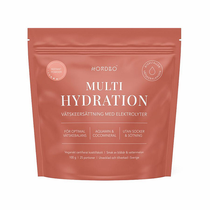 MULTI HYDRATION Výživový doplnok. - PRÍRODNÝ IONTOVÝ NÁPOJ - Špičková kvalita a čistota / Made in Sweden (GMO free) - Efektívne doplnenie elektrolytov a stopových prvkov - Komplexný doplnok - celkom 6 rastlinných zdrojov elektrolytov - Extrakt Aquamin F a Aquamin TG - CocoMineral® - prášok z koma melónu - Magnesium bisglycinát - Prírodná čučoriedková aróma - Certifikát I'm Vegan organizácie Djurens Rätt (Animal Rights) - Produkt neobsahuje živočíšne zložky, spojivá a nežiaduce balastné zložky - NORDBO = kvalita a klinicky preverené zdroje udržateľnosť a etická zodpovednosť Multi hy0 nápoj. Je určený pre efektívny doplnený elektrolytov (iónov) a zaistenie potrebnej hydratácie. Obsahuje celkom 6 (!) rastlinných zdrojov elektrolytov: