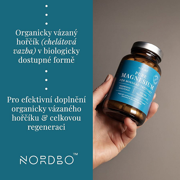 PURE MAGNESIUM Výživový doplnok s obsahom biologicky aktívneho horčíka. - PRE EFEKTÍVNE DOPLNENIE ORGANICKY VIAZANÉHO HORČÍKA A CELKOVÚ REGENERÁCIU - Špičková kvalita a čistota / Made in Sweden (GMO free) - Organicky viazaný horčík ( chelátová väzba) v biologicky dostupnej forme - Bisglycinát horečnatý - Bisglycinát horečnatý Šetrnosť k zažívaciemu traktu - Certifikát I'm Vegan organizácie Djurens Rätt (Animal Rights) - Produkt neobsahuje živočíšne zložky, spojivá a nežiaduce balastné zložky - NORDBO = kvalita a klinicky preverené zdroje udržateľnosť a etická zodpovednosť Nordbo Instant Magnesium obsahuje bisglycin vysoko dostupné formy horčíka. Bisglycinát horečnatý obsahuje horčík viazaný na aminokyselinu glycín, ktorý je organický a pre telo veľmi dôležité – pomáha celkovej regenerácii. Horčík obsiahnutý v doplnku sa veľmi rýchlo vstrebáva, je šetrný k zažívaciemu traktu a má vysokú biologickú využiteľnosť. Doplnok sa hodí na podporu aktívneho životného štýlu - vlastnosti horčíka súvisia s činnosťou svalov, s činnosťou nervového systému, s prevenciou kŕčov as odplavovaním kyseliny mliečnej po námahe. Vlastnosti horčíka taktiež súvisia so správnym spánkovým cyklom as aktiváciou vitamínu D (bez horčíka telo nedokáže vitamín D využiť). Produkt je vhodný pre všetkých jedincov zameraných na: - Efektívne doplnenie horčíka - Podporu aktívneho životného štýlu - Podporu spánkového cyklu