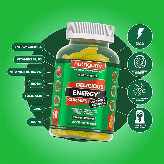 - Žuvacie želé s B komplexom - Prírodná príchuť tropické ovocie - Bez umelých sladidiel a farbív - S pridanými vitamínmi a minerálmi - Bioaktívne formy obsiahnutých látok - Vhodné pre vegetariánov i vegánov - Vitamín B2 (riboflavín), B3 (nikotínamid), B5 (kalcid hydrochlorid), - Vitamín B7 (D-biotín), B12 (metylkobalamín), kyselina listová (kyselina pteroylglutamová) - Jodid draselný, citrát zinočnatý Vitamínová želé nemusí byť plné umelých sladidiel a farbív! Ide si pochutnať aj bez syntetických látok. Želé Nutrigums® Energy B-Complex majú lahodnú prírodnú príchuť tropického ovocia a ľahko sa konzumujú. Telu dodávajú vitamíny skupiny B (B2, B3, B5, B6, B7 a B12), ktorých vlastnosti súvisia s energetickým metabolizmom, jodid draselný a citrát zinočnatý, minerály pomáhajúce harmonizovať organizmus pri veľkej záťaži a posilňujúci obranný štít. NUTRIGUMS® = ŽELÉ S BIOAKTÍVNYMI VITAMÍNMI A MINERÁLAMI NUTRIGUMS® = ŽELÉ BEZ UMELÝCH SLADIDIEL A FARBIV NUTRIGUMS® = ŽELÉ VHODNÉ PRE VEGETARIÁNOV A VEGANY Bioaktívne látky v 1 želé: - Vitamín B2 (ribofla (nikotínamid) - 4 mg - Vitamín B5 (kalcium D pantotenát) - 3 mg - Vitamín B6 (pyridoxín hydrochlorid) - 0,7 mg - Vitamín B7 (D-biotín) - 25 μg - Vitamín B12 (metylkobalamín ) - 75 μg - Kyselina μg - Jodid draselný - 75 μg - Citrát zinočnatý - 3 mg