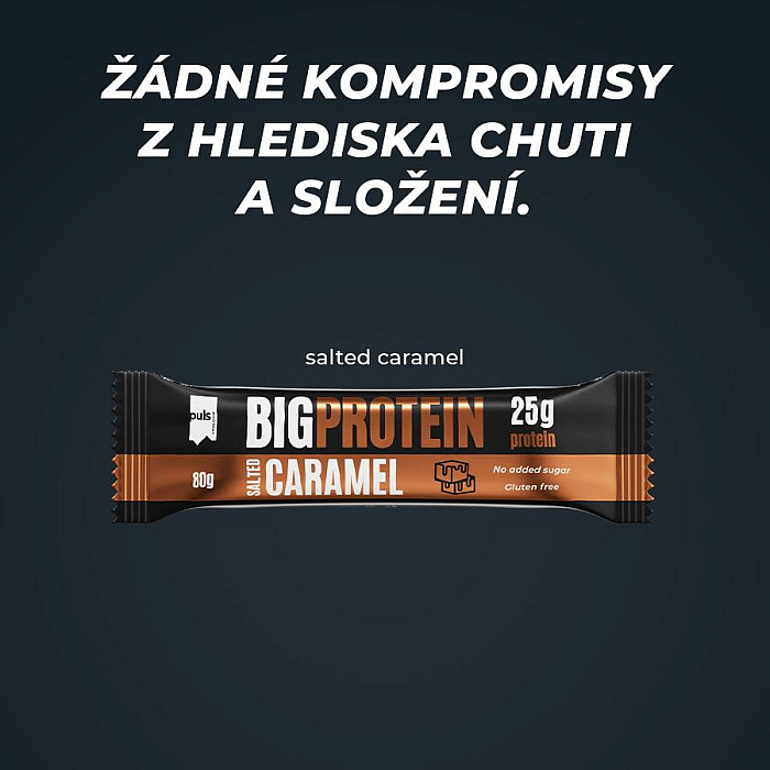Doplňte proteín a odmeňte sa! Big Protein – naša najnovšia a doposiaľ najväčšia proteínová tyčinka! Obsahuje skvelých 25 g vysoko kvalitných bielkovín, kolagénne peptidy, má nízky obsah cukru a lahodnú príchuť slaného karamelu. Táto tyčinka je navrhnutá tak, aby podporila svaly a regeneráciu po tréningu. Skvele poslúži aj ako desiata, keď vás prepadne poriadny hlad.