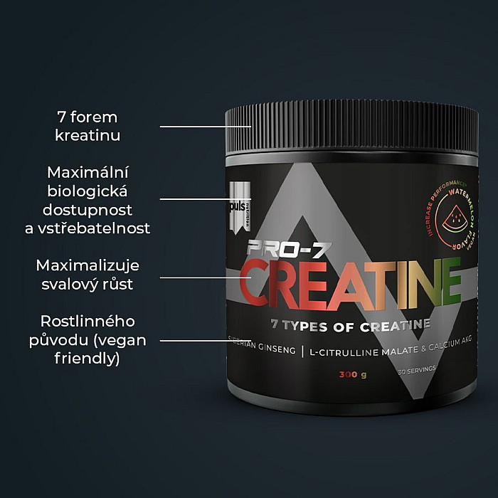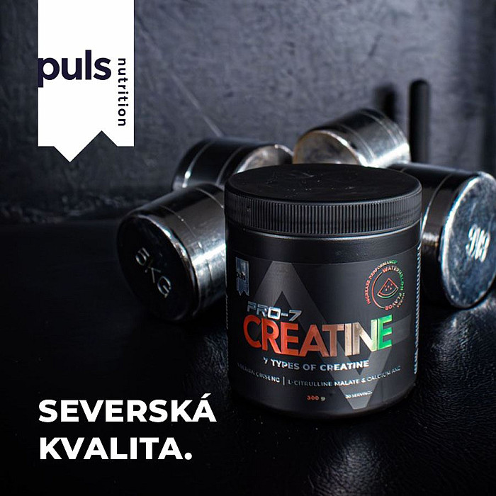 SEVERSKÁ KVALITA BEZ KOMPROMISU Maximalizujte silu a výkon. So siedmimi formami kreatínu v jednom. S elektrizujúcou chuťou vodného melónu. Naštartujte svoje vysoko intenzívne tréningy s PRO-7 Creatine – prémiovou funkčnou zmesou vytvorenou pre tých, ktorí mieria vysoko. Tento pokročilý produkt obsahuje 7 rôznych foriem kreatínu (!), ktoré spoločne podporujú fyzickú výkonnosť, silu a explozívny výkon. Pre maximálny efekt je formula doplnená o kombináciu troch sacharidových zdrojov (maltodextrín, dextróza a kukuričný škrob waxy maizeTM, ktoré zaisťujú vysokú biologickú dostupnosť a efektívne vstrebávanie. Tento výkonnostný super produkt s osviežujúcou príchuťou zeleného jablka ide ale ešte ďalej - obsahuje aj kalcium alfa-keto- ženšen, ktoré podporujú výkon, prekrvenie svalov a odolnosť voči záťaži. PRO-7 Creatine používajte rovnako ako bežný kreatín. Pravidelné užívanie kreatínu pomáha budovať čistú svalovú hmotu, zlepšuje regeneráciu medzi sériami a zvyšuje celkovú tréningovú kapacitu - vďaka tomu môžete trénovať tvrdšie a posúvať svoje limity rýchlejšie. Kreatín preukázateľne zvyšuje fyzickú výkonnosť pri opakovaných krátkodobých, vysoko intenzívnych výkonoch. Pozitívny účinok je dosiahnutý pri dennej dávke 3 g. Kreatín sa prirodzene vyskytuje v ľudskom tele a funguje ako rýchly zdroj energie pri svalových kontrakciách. Jeho pravidelná suplementácia v cykloch bola opakovane potvrdená ako účinný spôsob, ako zvýšiť tréningový výkon. Pre maximálny rozvoj sily, výkonu a svalovej regenerácie odporúčame kombinovať PRO-7 Creatine s Whey proteínom, Caseinom alebo Vegan Proteinom. Žiadne kompromisy z hľadiska jedinečnej chuti a zloženia. Fínska značka PULS NUTRITION patrí vo všetkých ohľadoch k absolútnej špičke športovej a doplnkovej výživy.
