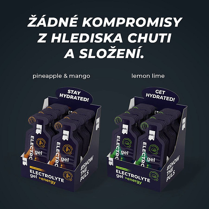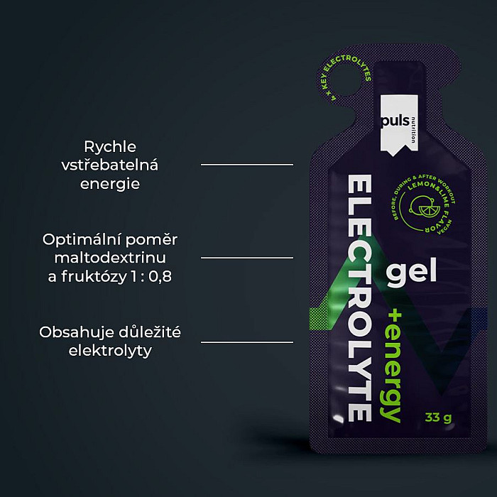 SEVERSKÁ KVALITA BEZ KOMPROMISU Podpora vytrvalostného výkonu. Zaistite si optimálnu hydratáciu s gélom PULS Electrolyte energy. Tento hotový gél je ideálnou voľbou na hydratáciu organizmu a doplnenie elektrolytov. Elektrolytový gél je navrhnutý na optimalizáciu výkonu pri vytrvalostných športoch, ale ocení ho každý, kto potrebuje doplniť stratené elektrolyty a energiu a udržať rovnováhu telesných tekutín. Gél s príchuťou citróna a limetky je rýchlo vstrebateľný a ľahko konzumovateľný aj počas pohybu. Obsahuje maltodextrín, fruktózu, chlorid draselný, citrát horečnatý a morskú soľ.