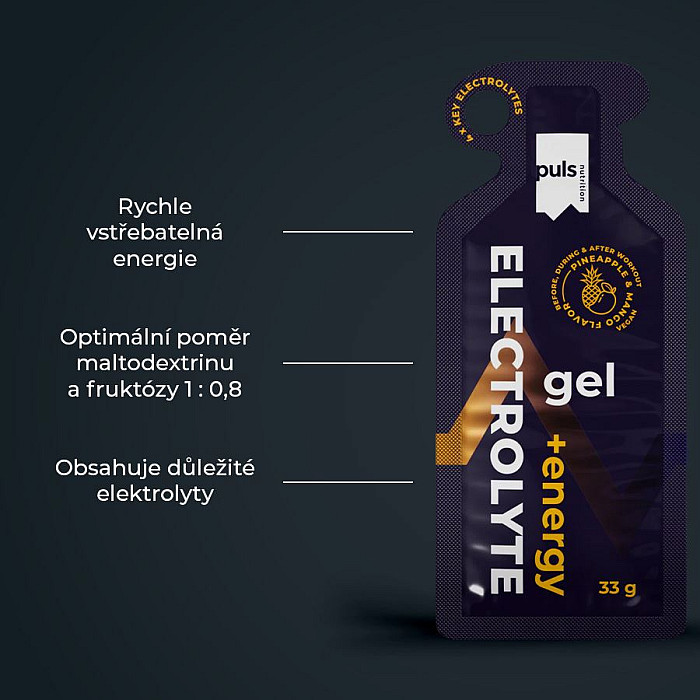 SEVERSKÁ KVALITA BEZ KOMPROMISU Podpora vytrvalostného výkonu. Zaistite si optimálnu hydratáciu s gélom PULS Electrolyte energy. Tento hotový gél je ideálnou voľbou na hydratáciu organizmu a doplnenie elektrolytov. Elektrolytový gél je navrhnutý na optimalizáciu výkonu pri vytrvalostných športoch, ale ocení ho každý, kto potrebuje doplniť stratené elektrolyty a energiu a udržať rovnováhu telesných tekutín. Gél s príchuťou ananásu a manga je rýchlo vstrebateľný a ľahko konzumovateľný aj počas pohybu. Obsahuje maltodextrín, fruktózu, chlorid draselný, citrát horečnatý a morskú soľ.