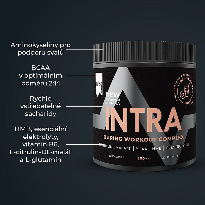 Doplňte energiu počas tréningu. Maximalizujte svoje tréningové výsledky s komplexom PULS Intra Workout! Táto účinná zmes aminokyselín, sacharidov a elektrolytov je navrhnutá tak, aby vás podporila aj počas tých najnáročnejších a najintenzívnejších tréningov. Je určená na konzumáciu počas cvičenia – teda v čase, keď ju vaše telo a svaly potrebujú najviac. Bez cukru, s obsahom 4 g rýchlo vstrebateľných sacharidov z vysoko rozvetveného cyklického dextrínu pre dlhotrvajúcu energiu. Kombinácia zahŕňa aj komplexné spektrum aminokyselín, vrátane 3 g BCAA v osvedčenom pomere 2:1:1, citrulín malát na posilnenie účinku a L-glutamín ako palivo pre svaly a podporu regenerácie. Tento výkonnostný nápoj sa odlišuje svojou komplexnou formulou – obsahuje navyše aj HMB na podporu ochrany svalovej hmoty, kľúčové elektrolyty pre optimálnu hydratáciu a vitamín B6, ktorý prispieva k normálnemu metabolizmu bielkovín a glykogénu. Všetky zložky pôsobia synergicky, aby vám pomohli posunúť výkon na ďalšiu úroveň a predĺžiť tréningovú kapacitu. Pre maximálnu podporu tréningu kombinujte s kvalitným pre-workout komplexom pred cvičením a po tréningu doplňte účinný regeneračný alebo proteínový nápoj.