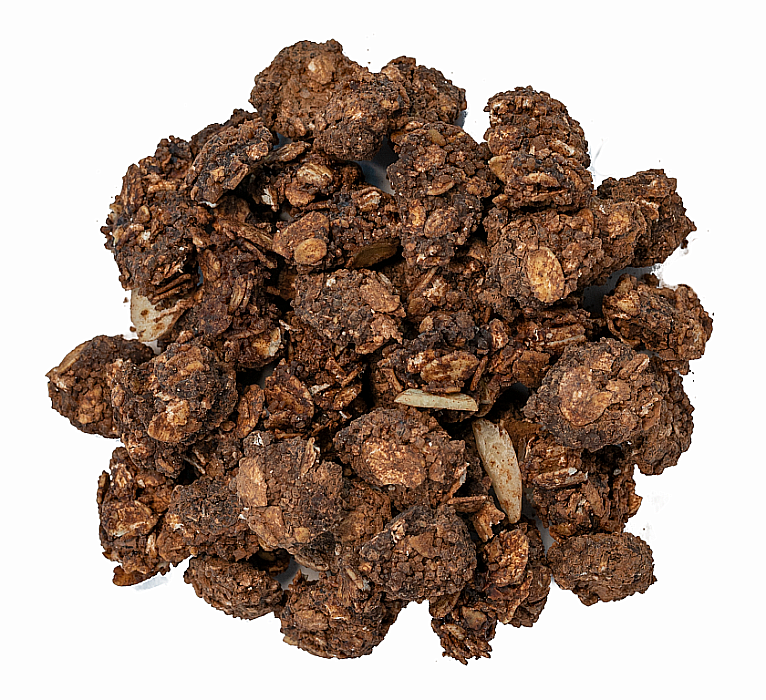 Zloženie: Bezlepkové ovsené vločky 48%, čokoláda (obsah kakaa min. 58% - cukor, kakaová hmota, kakaové maslo, emulgátor: sójový lecitín, prírodná vanilková aróma) 12%, tapiokový sirup, trstinový olej, plátky mandlí 7%, , kakaový prášok