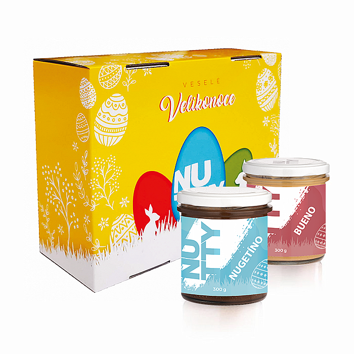 Veľkonočný balíček s tromi najobľúbenejšími maslami - NUTTY Bueno, Slaný karamel white a Nugetíno. Všetky majú tematickú etiketu a ani s jedným nešliapnete vedľa.